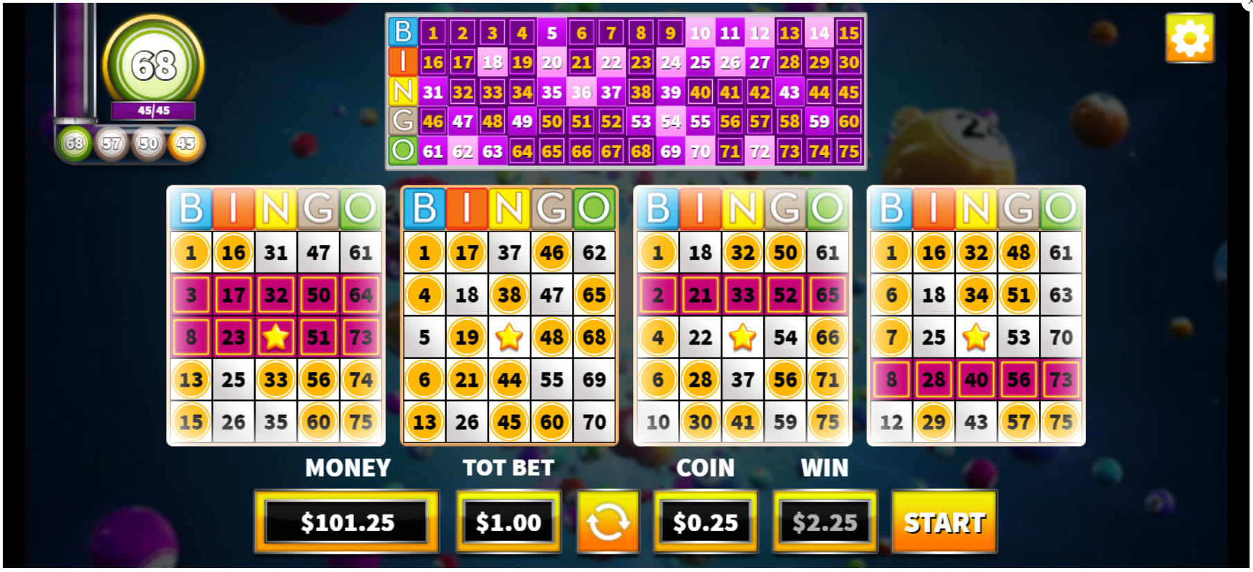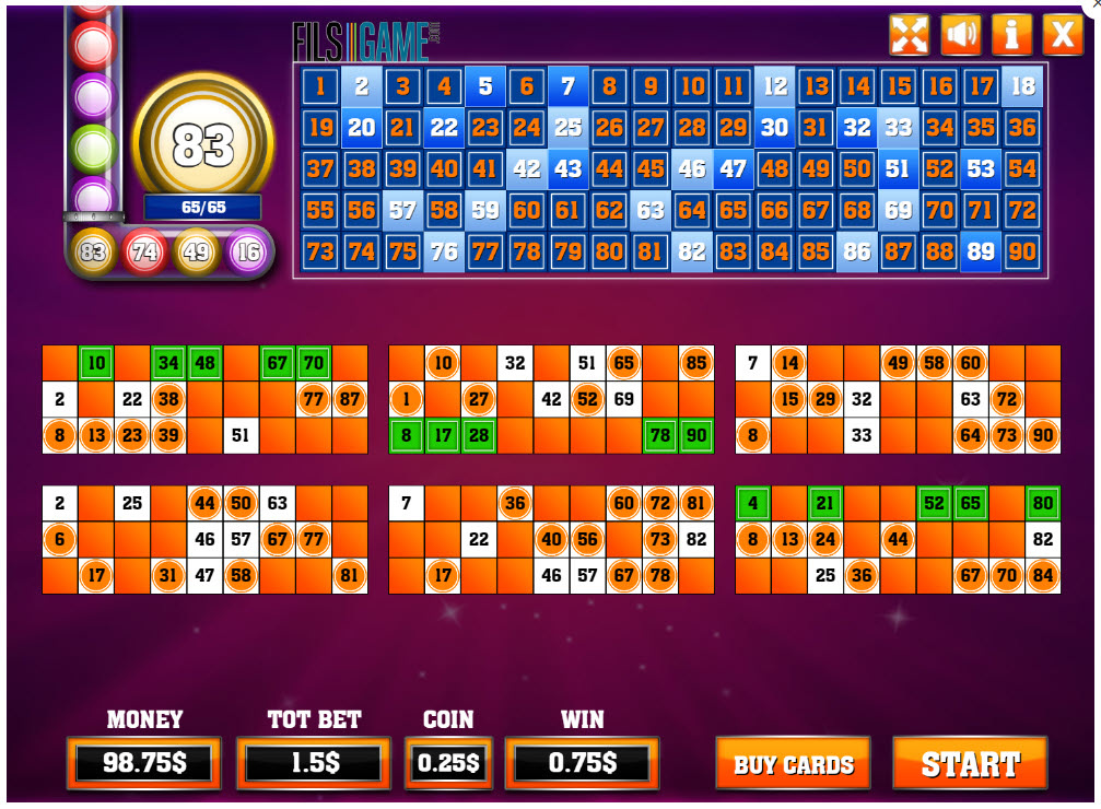 Bingo 75:tä pelataan 5x5 amerikkalaisilla bingokorteilla, joissa on vapaa ruutu. Pelaaja saa pelata vain yhden kortin kerrallaan. Anteeksi, jos en osaa laskea kertoimia tässä, sillä 5x5-bingon matematiikka on melko monimutkaista. Ottaen huomioon Fils Gamen toisen bingopelin, jossa on 90 numeroa, kauheat kertoimet, epäilen, että tämän pelin kertoimet ovat myös kauheat.