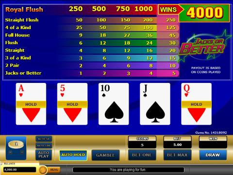 Videopokerikäsianalysaattorini avulla voimme nähdä, että viiden kolikon panoksella oikea pelitapa on pitää vain ässä ja kuningatar. Strategia voi kuitenkin olla oikea alle maksimimäärän kolikoita panostaessa. AQ-5 olisi oikea pelitapa yhdestä neljään kolikkoa panostaessa. Kuten kuitenkin näet, panostan viisi kolikkoa.