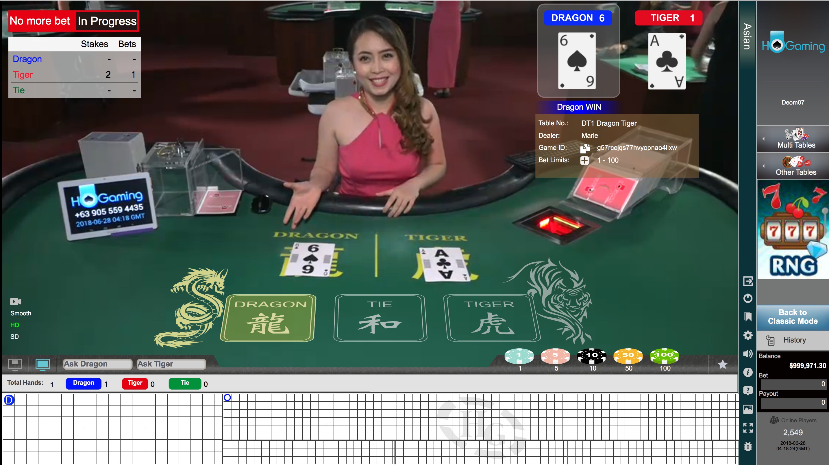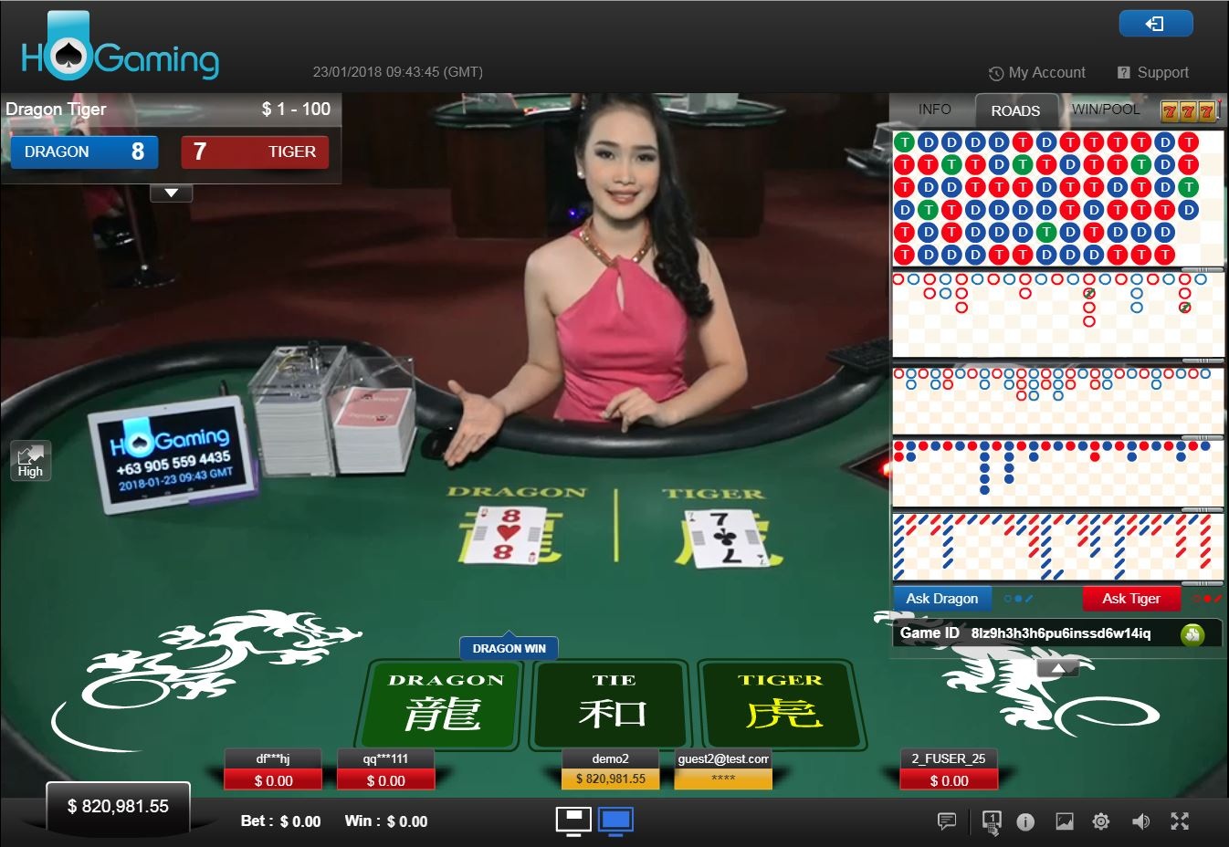 Dragon Tiger on hyvin yksinkertainen peli, jossa sekä Dragon että Tiger saavat kumpikin yhden kortin ja pelaaja saa sen, kumpi on korkeampi. Myös tasapelille on panostus. Dragon- ja Tiger-panokset häviävät puolet tasapelissä, jolloin talon etu on 3,73 %. HoGamingin verkkosivusto ei kerro, kuinka paljon tasapeli maksaa, mutta muissa live-jakajapeleissä voittokerroin on tyypillisesti 8:1, jolloin talon etu on 32,77 % (ai!).