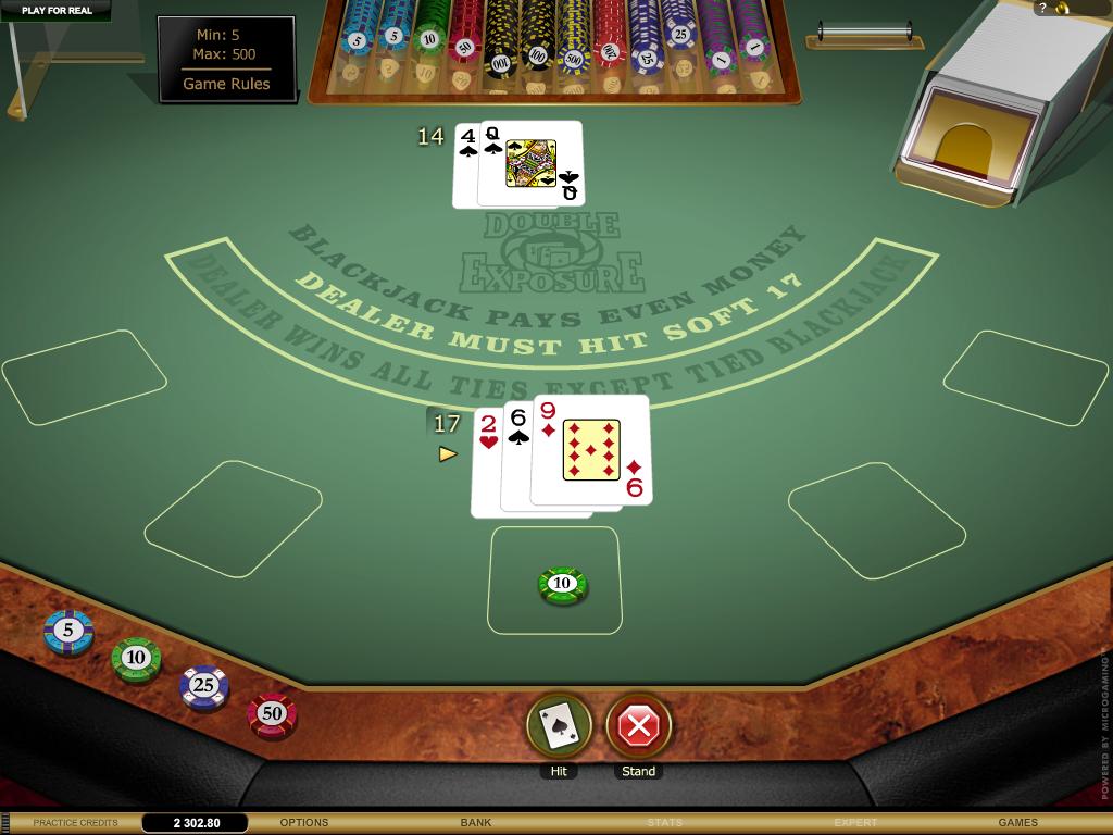 Vanhentuneiden pöytäpelien perinteitä kunnioittaen Microgaming tarjoaa Double Exposure -pelin . Niille, jotka eivät tunne peliä, sitä pelataan kuten blackjackia, paitsi että molemmat jakajan kortit ovat näkyvissä. Tässä tapauksessa pelaaja häviää useimmat tasapelit ja blackjack maksaa tasarahat. Tässä ovat Microgamingin erityiset säännöt.