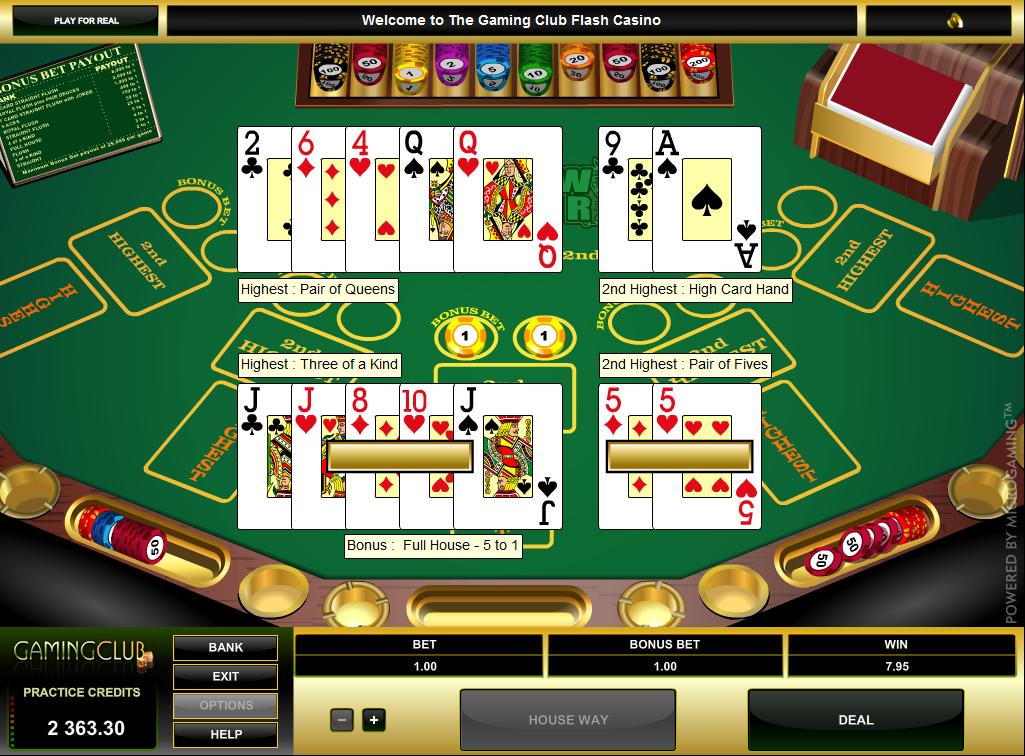 Säännöt ovat samat kuin peruspelissä. Microgamingin versio noudattaa tavanomaista 1-4-5 Ante Bonus -voittotaulukkoa, jossa talon etu on 3,37 % Ante-panoksella. Pairplus-panoksella käytetään liberaalia 1-4-6-30-40-taulukkoa, jossa talon etu on 2,32 %.