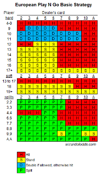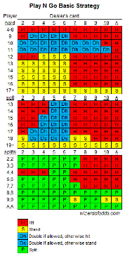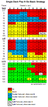 Näiden sääntöjen mukaan talon etu on 1,26 %. Ei ole mitään syytä pelata tätä peliä, kun peruspelissä on 0,46 %:n talon etu. Jos kuitenkin on pakko, napsauta alla olevaa kuvaa nähdäksesi suuremman version näiden sääntöjen perusstrategiasta. Varoitus, kyseessä on epätavallinen strategia epätavallisten sääntöjen vuoksi.