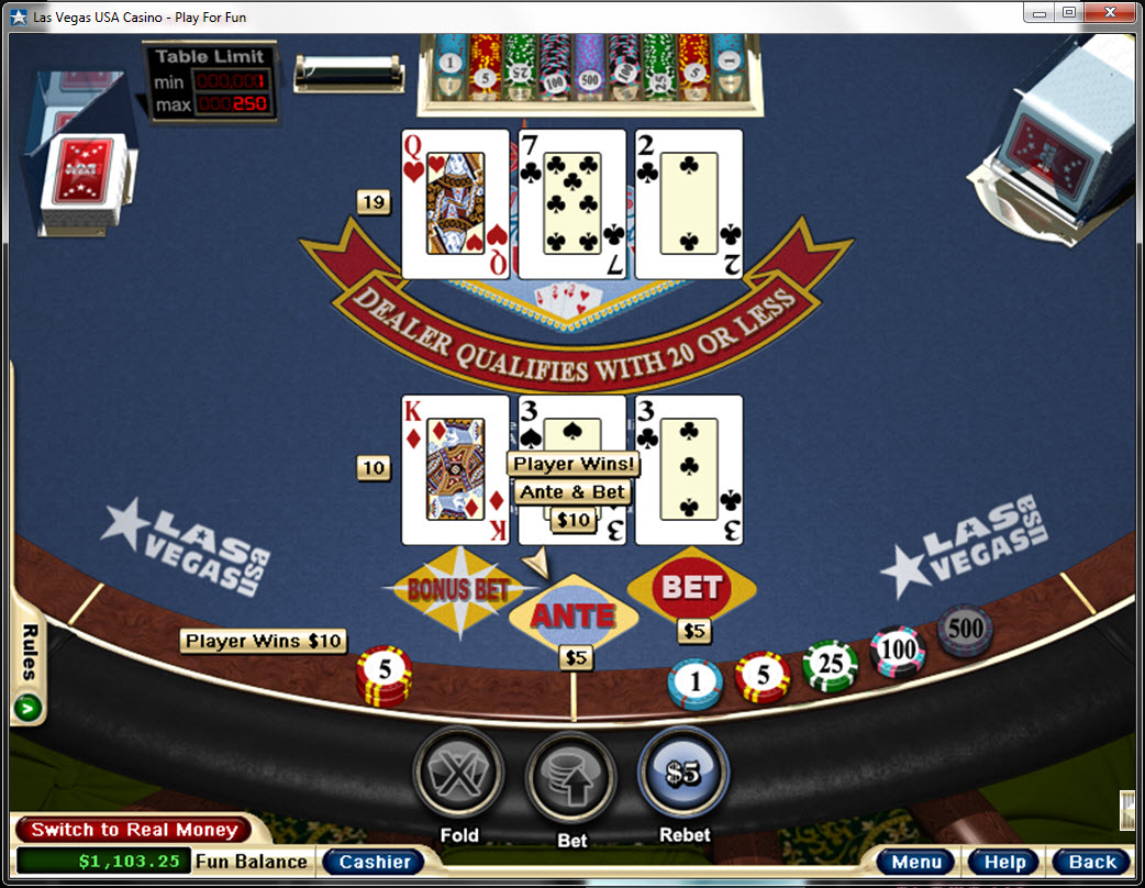 Peli on samanlainen kuin Three Card Poker, mutta käsien pisteytys on hyvin erilainen ja kertoimet ovat paremmat. Talon etu on 3,23 % alkupanoksella ja 3,54 % bonuspanoksella. Kaikki tiedot löytyvät Vegas Three Card Rommy -osiostani.
