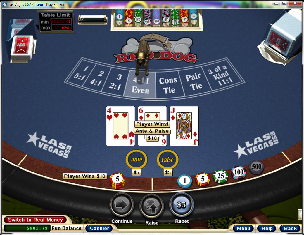 Tavallisia Red Dogin sääntöjä noudatetaan. Minulle kerrottiin, että käytetään kahta pakkaa, jolloin talon etu on 3,08 %.