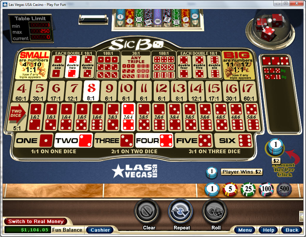 RTG noudattaa Macaon voittotaulukkoa sic bossa . Seuraava taulukko näyttää kunkin panoksen voiton, voittotodennäköisyyden ja tuoton. Kuten aina sic bossa, suosittelen pitämään sekä pienet että suuret panokset, joissa talon etu on pienin, 2,78 %.