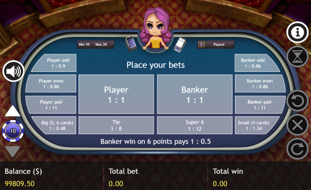 Baccarat-peliä pelataan vakiosäännöillä, ja voittava Banker-panos maksaa 0,95. Pelissä on useita sivupanoksia, jotka ovat täsmälleen samat kuin alla olevassa Super 6 -osiossa. Ainoa ero on se, että talon etu Banker-panoksessa on 1,06 %, kun se Super 6:ssa on 1,46 %, eikä Super 6 -sivupanosta ole.