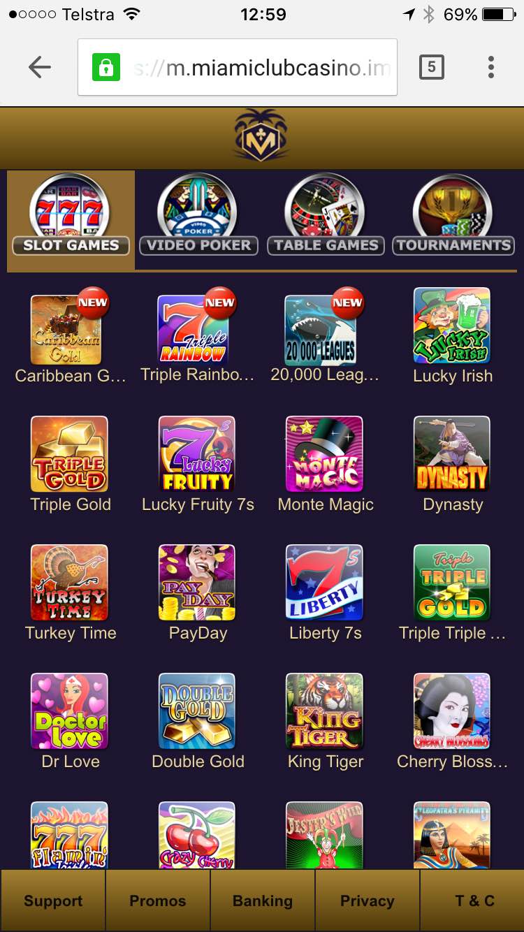 Toinen esimerkki kasinosta, jossa voit nauttia Wizard of Odds -mainostakuun eduista, on Miami Club Casino . Jälleen kerran, koko pelivalikoima ei ole saatavilla mobiililaitteilla kuten PC:llä. Esimerkiksi pöytäpelien alla näyttää olevan vain kuusi peliä, mukaan lukien neljä versiota Blackjackista, ja jostain syystä niihin kuuluu myös Keno , jota en luokittelisi pöytäpeliksi. Miami Clubin sivustolla niitä on saatavilla yli kolme kertaa enemmän.